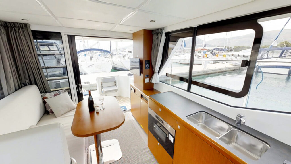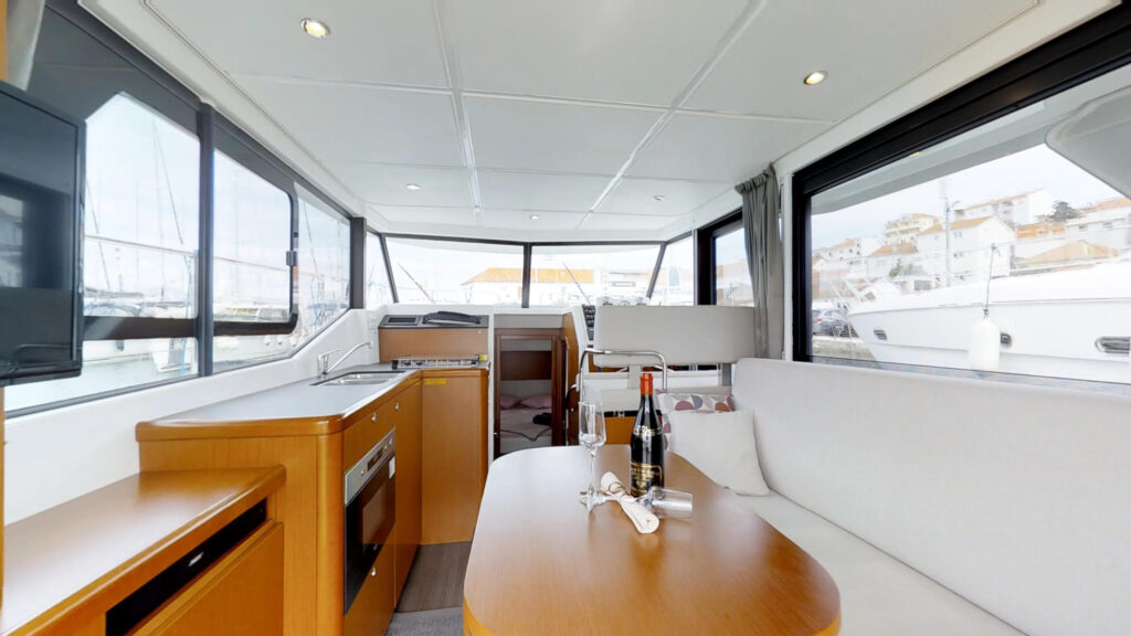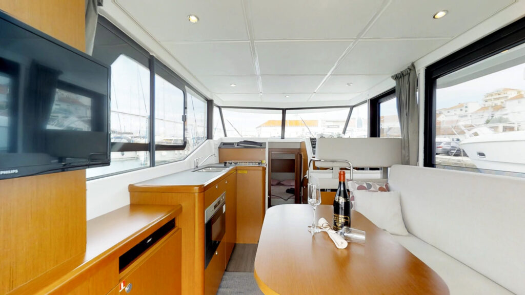 With modular fittings and openings, the Swift Trawler 30 is designed for a comfortable lifestyle, offering ample space and light to create an airy feel. She can adapt to all crew configurations thanks to foldaway seats, a convertible sofa, and a well-designed table that slides beneath the seats to increase space in the reception area.