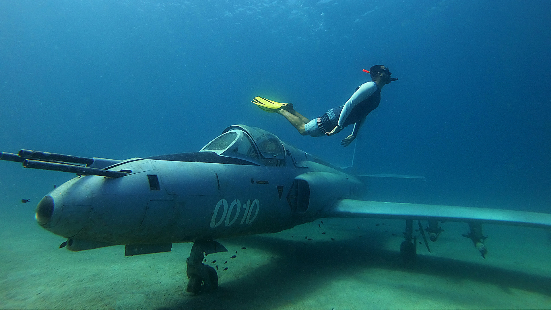 Explore a cosmetically renovated Soko Jastreb J-21 attack jet, now resting on the seabed at a depth of 10 meters.